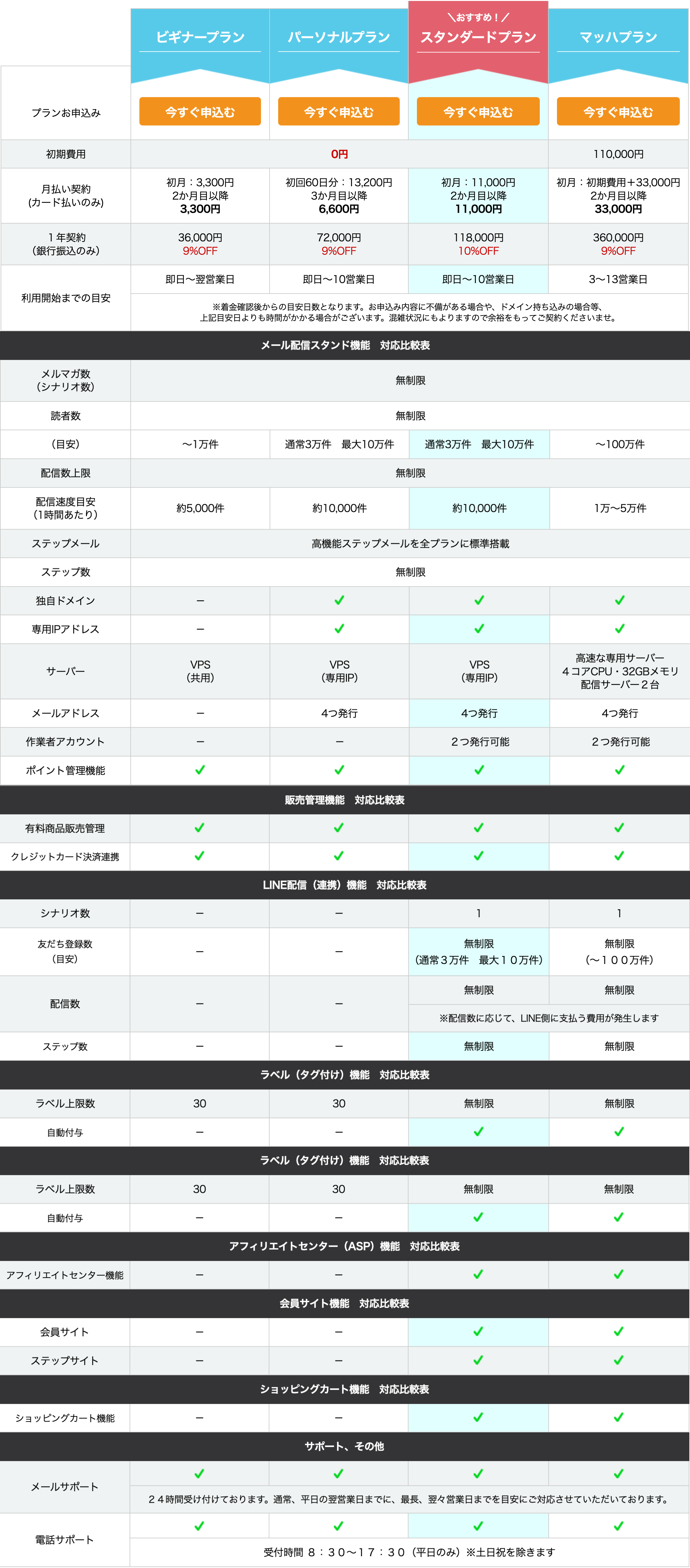 とありますが、初心者の方はビギナーで十分かと思います。ただし、ビギナープランでは、無料のアドレス(GmailやYahoo!メールなど)を使うことができませんので、別途、ご自身で有料のアドレスを取得していただく必要があります。また、ビギナープランでは、SPF設定をしていただく必要があります。